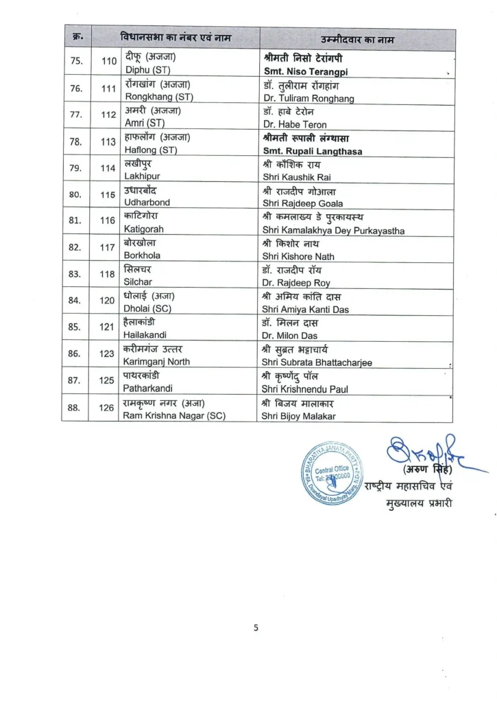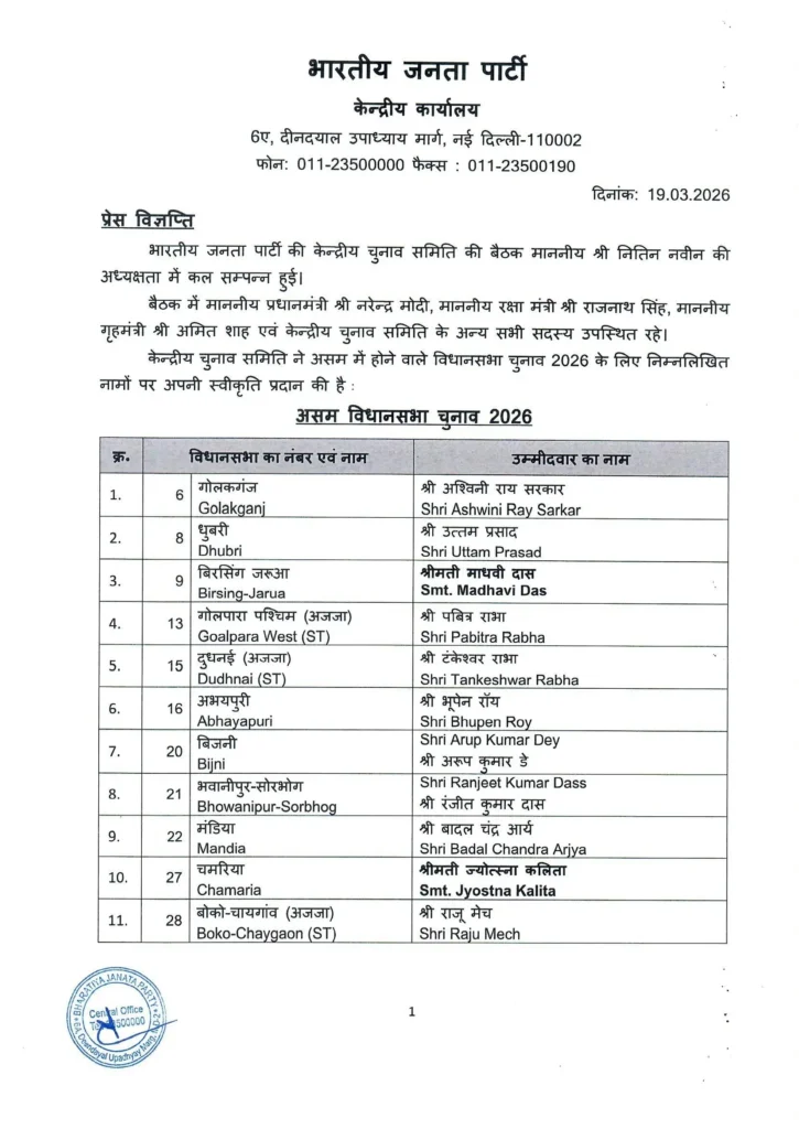 The Bharatiya Janata Party (BJP) has announced its list of candidates for the upcoming Assam Assembly elections scheduled for next month. The party will contest 88 seats, while its allies—the Asom Gana Parishad (AGP) and the Bodoland People’s Front (BPF)—will contest 26 and 11 seats respectively as part of the alliance arrangement.
