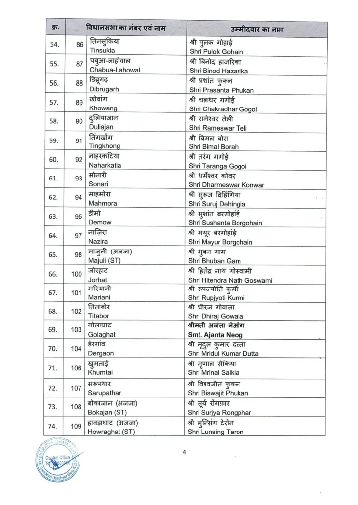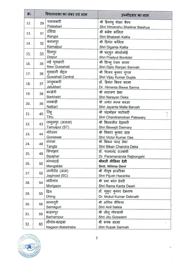 Several senior leaders have also been retained in their respective constituencies. These include Pijush Hazarika from Jagiroad, Bimal Borah from Tinkhong, Bhabesh Kalita from Rangia, Ashok Singhal from Dhekiajuli, Ranoj Pegu from Dhemaji, Ajanta Neog from Golaghat, Krishnendu Paul from Patharkandi, Ranjeet Kumar Dass from Bhowanipur-Sorbhog, and Jayanta Malla Baruah from Nalbari.