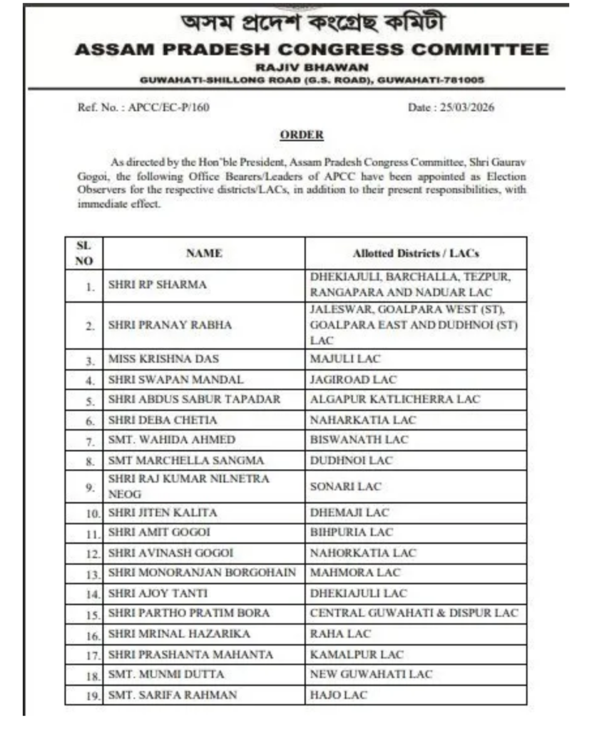 Among the key assignments, RP Sharma will oversee Dhekiajuli, Barchalla, Tezpur, Rangapara, and Naduar LACs, while Pranay Rabha has been assigned Jaleswar, Goalpara West (ST), Goalpara East, and Dudhnoi (ST). Other notable appointments include Krishna Das for Majuli LAC, Swapan Mandal for Jagiroad, and Abdus Sabur Tapadar for Algapur and Katlicherra.