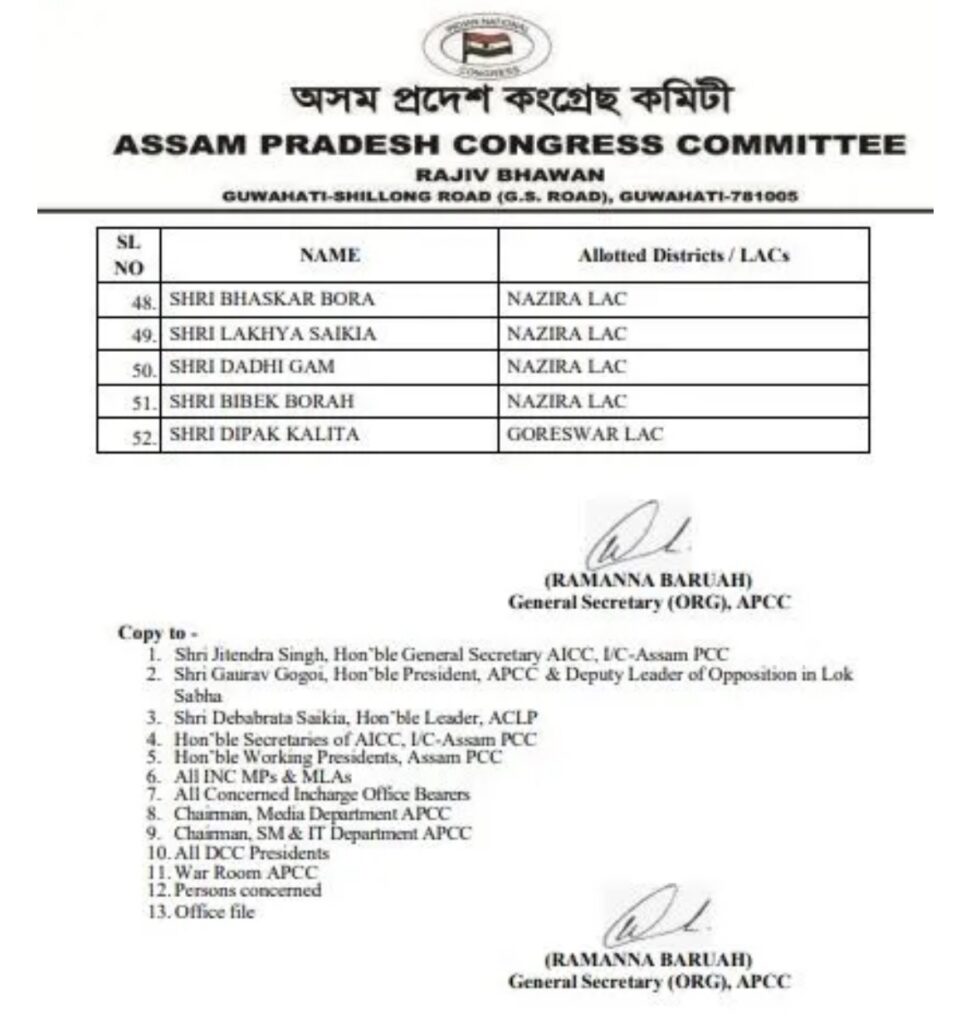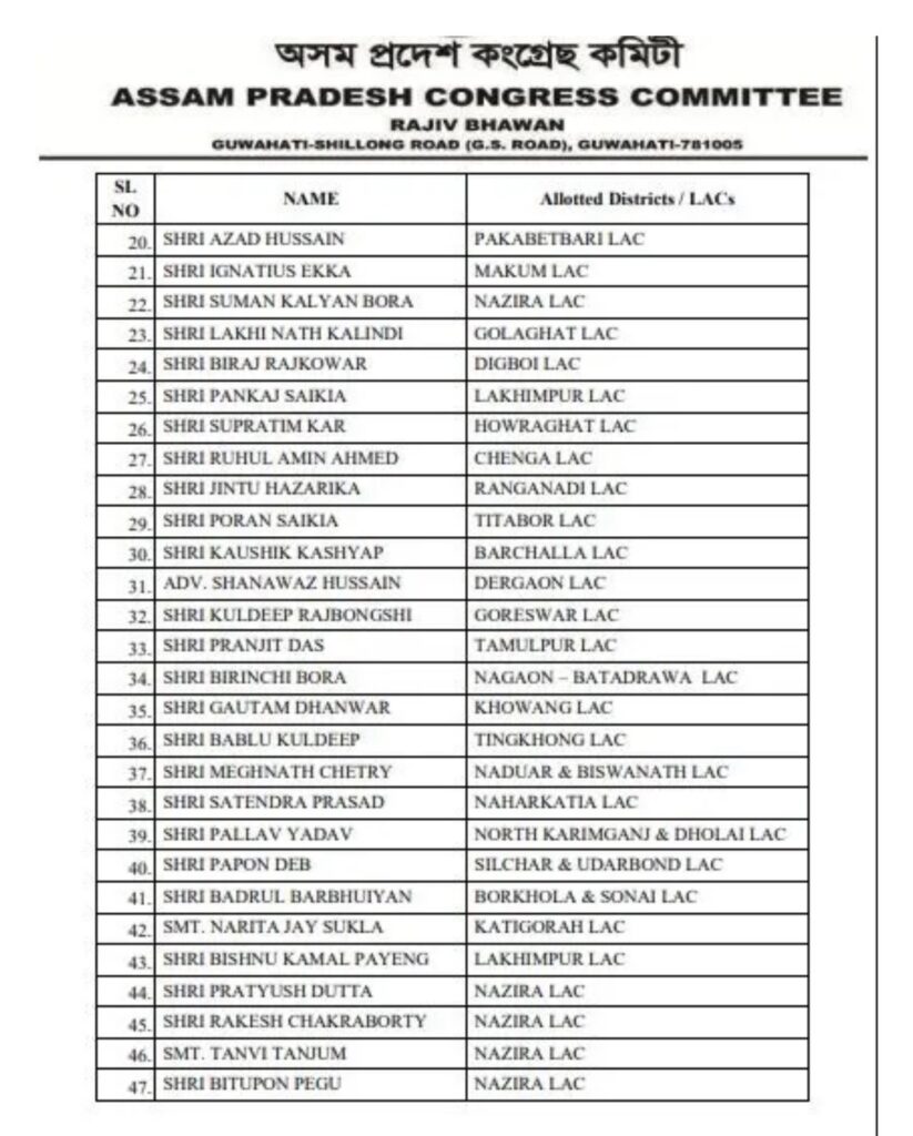 Additionally, Nazira LAC has been assigned to multiple observers, including Lakhya Saikia, Dadhi Gam, and Bibek Borah, while Dipak Kalita will oversee Goreswar LAC. Several leaders have been entrusted with more than one constituency, reflecting the party’s strategy to ensure experienced oversight in key regions.